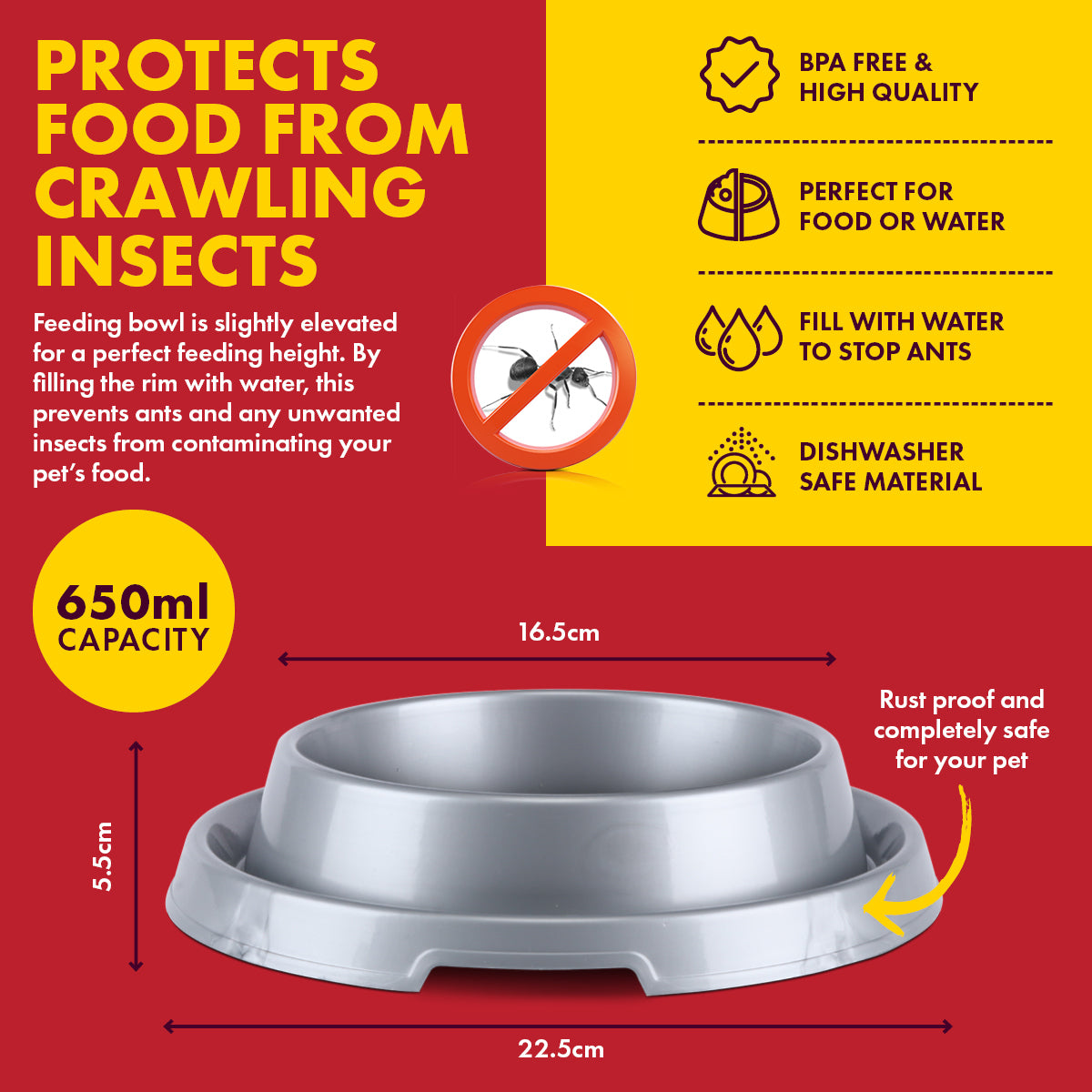 Pet Basic® Cleverly designed featuring an outer channel which is to be filled with water, preventing ants from reaching your pets food. Your furry friend will enjoy eating and drinking ant free.